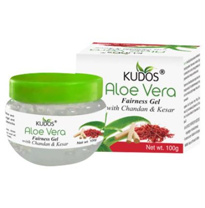 Kudos Aloe Vera Fairness Gel Aloe Vera Fairness Gel Chandan and Kesar extracts with Aloe Vera that work within the inner layers of skin which reduce melanin to give freedom from sun burns, tanning, dark spots and pigmentation. The gel provides antioxidant and nourishment which boosts skin's defense against dullness and roughness to promote fairness and brightness. Aloe Vera Fairness Gel Use & Benefit: Aloe Vera Fairness Gel Chandan and Kesar extracts with Aloe Vera that work within the inner layers of skin which reduce melanin to give freedom from sun burns, tanning, dark spots and pigmentation. The gel provides antioxidant and nourishment which boosts skin's defense against dullness and roughness to promote fairness and brightness.