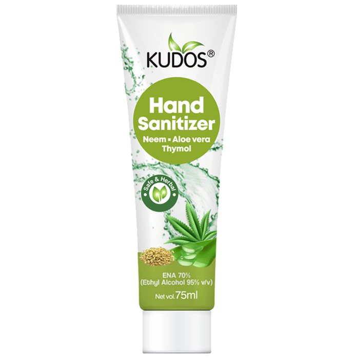 Kudos hand Sanitizer has antiseptic and anti-microbial properties which are very useful against harmful microorganisms. It helps to keep hands clean, soft, and smooth. | Key Ingredients: ENA 70% (Ethyl Alcohol 95% v/v) Neem Aloe vera Thymol | Key Benefits: Cleanses as well as moisturises hands without drying the skin Dries swiftly and ensures hygiene Kills germs without the use of soap and water | Directions For Use: Dispense desired amount onto palm Rub on all parts of hands until fully dry. Do not rinse | Safety Information: Read the label carefully before use Store in a cool dry place away from direct sunlight Keep out of reach of the children Keep away from fire or flame Avoid contact with eyes and broken skin In case of contact with eyes rinse thoroughly with water, if irritation persists consult your doctor