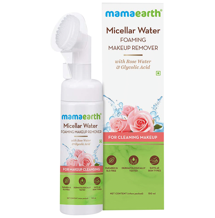 Mamaearth Micellar Water Foaming Makeup Remover Mamaearth Micellar Water Foaming Makeup Remover effortlessly removes makeup without irritating the delicate skin. It's as simple as a pump, massage and washing with the built-in brush. This makeup remover with a built-in brush is enriched with Micellar water, a potent but gentle blend of natural elements like glycerin and rose water that will leave you with cleansed and radiant skin.