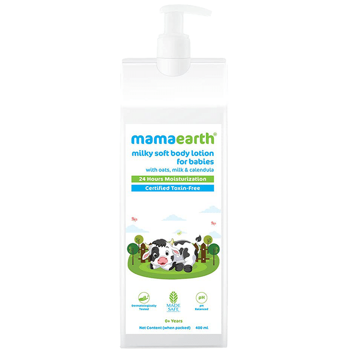 Mamaearth Milky Soft Body Lotion for Babies Mamaearth Milky Soft Body Lotion for Babies is created with your child in mind! It hydrates your baby's sensitive skin, banishes dryness, and locks in the skin's natural oils, keeping your munchkin's skin soft all day. It provides gentle and safe treatment to your baby by making their skin supple and silky, thanks to the natural benefits of oats, milk and calendula. Calendula is high in vitamin E and amino acids, leaving skin richly nourished. Oat Milk has a lot of hydrating and soothing effects, which helps to get rid of dry and irritated skin. It is MadeSafe Certified, and it contains no silicones, parabens, mineral oil, or colours, as part of our no toxins, no hazardous chemicals philosophy.