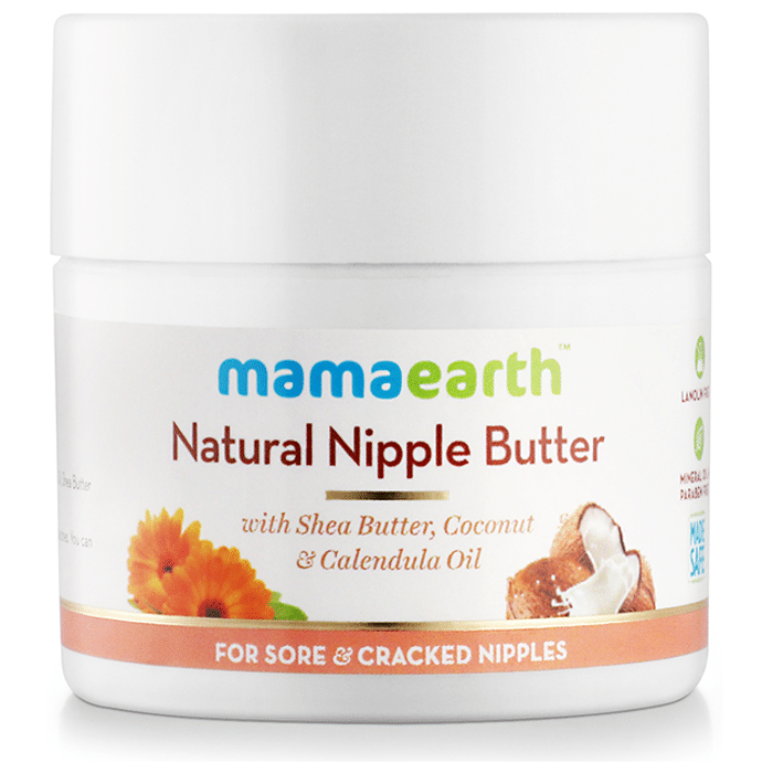 Mamaearth Nipple Butter helps to moisturize the skin and provide a protective layer to help sore and chapped nipples heal faster. It helps to heal and nourish the skin of the nipples. | Key Ingredients: Virgin coconut oil Extra virgin olive oil Beeswax Calendula extract Shea butter Vitamin E | Key Benefits: A coconut oil based cream that helps in nourishing the skin of the nipples It helps moisturize the skin and provide a protective layer to help sore and chapped nipples heal faster Calendula extracts provide a soothing effect to the cracked nipples It’s lanolin-free and safe for mama and baby | Directions For Use: Apply after each feed, or as needed on dry breast patches Can also be used as a face cream for baby's dry cheeks | Safety Information: Read the label carefully before use Keep out of the reach of children Should be protected from direct light Avoid the contact with eyes In case of contact with eyes, remove with water immediately