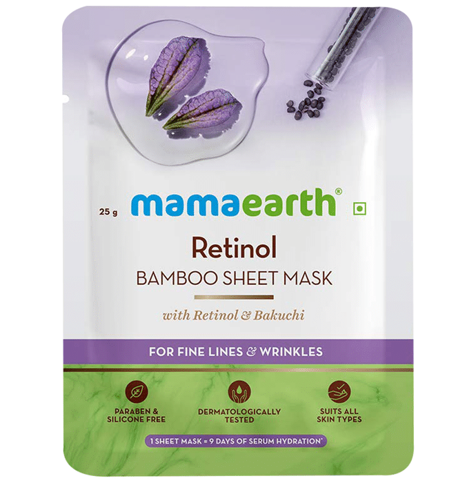 Mamaearth Retinol Bamboo Sheet Mask decreases the appearance of open pores and fights the major indicators of ageing. It features a light-as-air sheet that feels soft and weightless on the skin. From reducing dullness to providing rapid hydration, each sheet mask in this collection has been carefully selected to address a variety of skin conditions, so you can rest assured that you will find one that meets your needs. This sheet mask is the perfect companion for a fast outing with friends or a dinner date with your best friend. | Key Ingredients : Aqua Glycerin Retinol | Key Benefits : Mamaearth Retinol Bamboo Sheet Mask is a wellness product crafted for maintaining the health of your skin It contains retinol acid that hydrates, moisturises and boosts collagen to improve the texture of the skin It helps skin look plump, feel soft and feel refreshed every time of the day It provides instant hydration, helps with skin issues such as dryness, dull skin and others | Directions For Use: Use as directed on the label. | Safety Information : Read the label carefully before use Store in a cool and dry place away from direct sunlight Keep out of reach of children