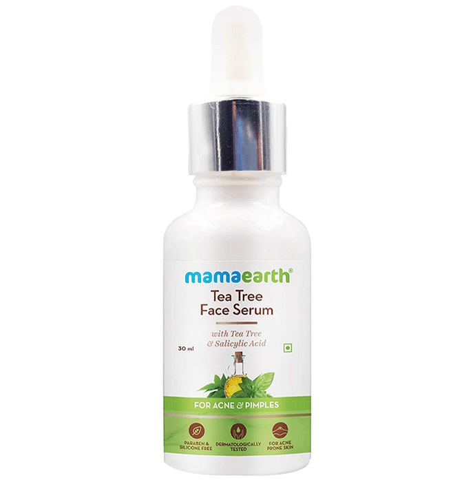 Mamaearth Tea Tree Face Serum helps decrease acne scars and blemishes, diminishes enlarged pores and enhances overall skin texture. Niacinamide is a type of Vitamin B3+ that has been shown to balance natural sebum levels and prevent overproduction in skincare. It is a powerful antioxidant that lowers inflammation, evens out skin tone and restores suppleness while decreasing enlarged pores. On the other hand, ginger extract is an antioxidant that prevents collagen breakdown and encourages melanin formation to even out skin spots. | Key Ingredients: Niacinamide Ginger extract Glycerin Vitamin C Turmeric | Key Benefits: Mamaearth tea tree face serum helps reduce and reverse hyperpigmentation and acne spots Contains vitamin C that helps to combat dark spots and also prevents excess melanin production Antioxidants in Ginger Extract also helps to fade acne scars and prevents irritation due to acne Niacinamide, an active form of Vitamin B3+, controls sebum production and reduce acne symptoms | Directions For Use: Use as directed on the label. | Safety Information: Read the label carefully before use Store in a cool and dry place away from direct sunlight Keep out of reach of children