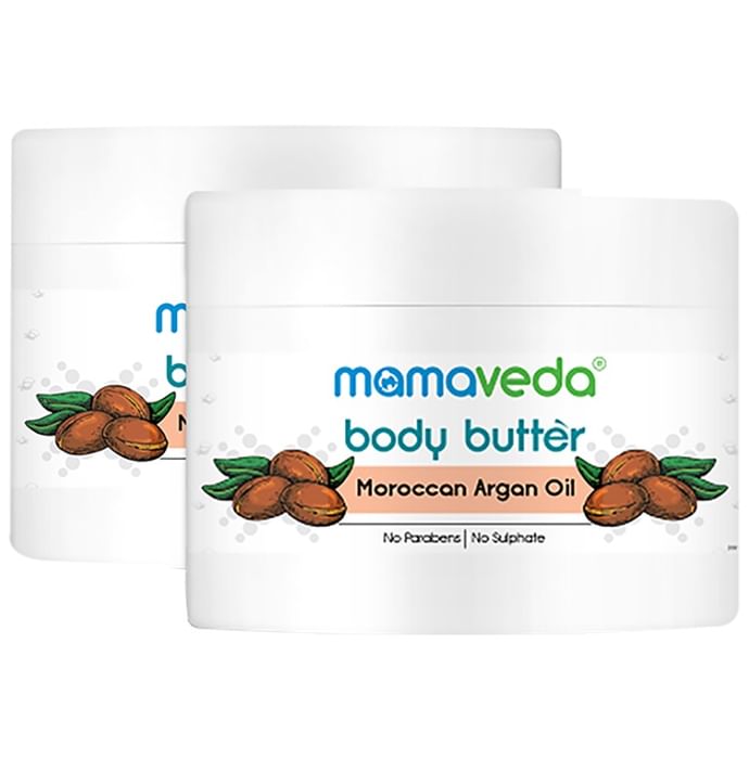 Mamaveda Moroccan Argan Oil Body Butter (200gm Each) is high in vitamins A, E and essential fatty acids. The nutrients in this butter help break down dead skin cells and slow down the effects of skin ageing. It also provides hydration and nourishment to keep skin soft and hydrated. The base for this butter is a nourishing skin treat. The unique combination of antioxidant and moisturising properties in this butter can help to maintain skin elasticity while preventing moisture loss that can contribute to the ageing process. | Key Ingredients : Argan oil She butter Vitamin E Sweet almond oil | Key Benefits : Rich body butter with the goodness of Moroccan argan oil, shea butter and sweet almond oil, to help nourish and protect dry, ageing skin It is a lightweight body butter that glides on like a dream and locks in moisture for hours The antioxidants in butter help in the regeneration of cells and regular use helps prevent wrinkles This body butter provides hydration and nourishment while making skin feel good throughout the day Butter can help to maintain skin elasticity while preventing moisture loss that can contribute to the ageing process | Directions For Use : Use as directed on the label. | Safety Information : Read the label carefully before use Store in a cool and dry place away from direct sunlight Keep out of reach of children