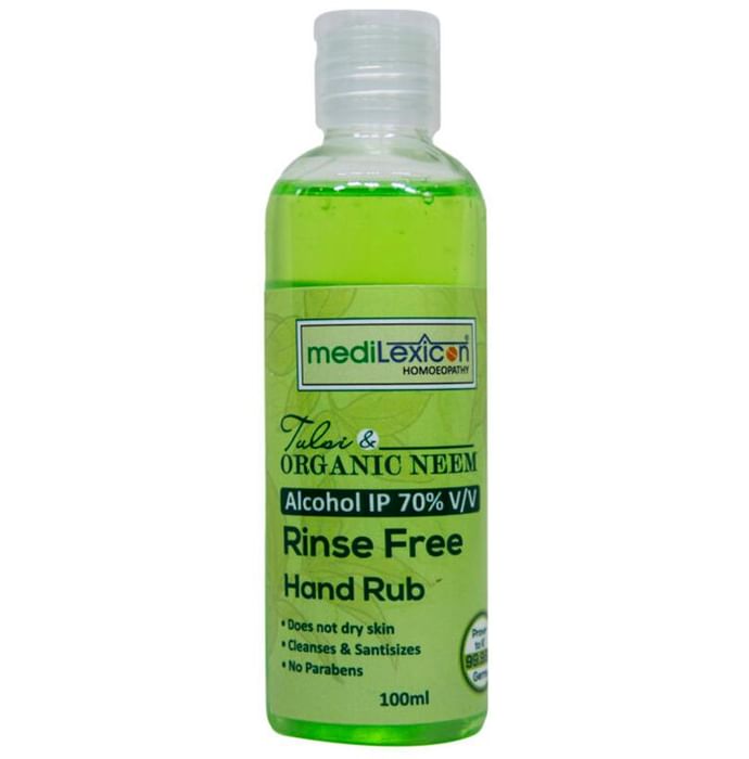 Medilexicon Rinse Free Hand Rub Sanitizer Tulsi & Organic Neem has antiseptic and anti-microbial properties, which are very useful against harmful microorganisms. It helps to keep hands clean, soft, and smooth. It prevents germs from coming into touch with sanitizer pumps, which may contain germs, resulting in a 10x increase in germ protection. | Key Ingredients: Alcohol Tulsi Neem | Key Benefits: It helps to cleanse and get rid of the impurities It is one of the most effective sanitizers and protects you from disease-causing germs, viruses, and bacteria The sanitizer has anti-bacterial, antiviral, anti-inflammatory and anti-fungal properties It has a quick-drying and fast-acting formulation and effectively kills 99.9% of germs from your hands and protects you from health issues It provides a sustainable antibacterial effect even after evaporation of the alcohol The natural moisturising properties of aloe vera and glycerol prevent moisture loss | Directions For Use: Use as directed on the label or as advised by your healthcare provider. | Safety Information: Read the label carefully before use Store in a cool and dry place away from direct sunlight Keep out of reach of children