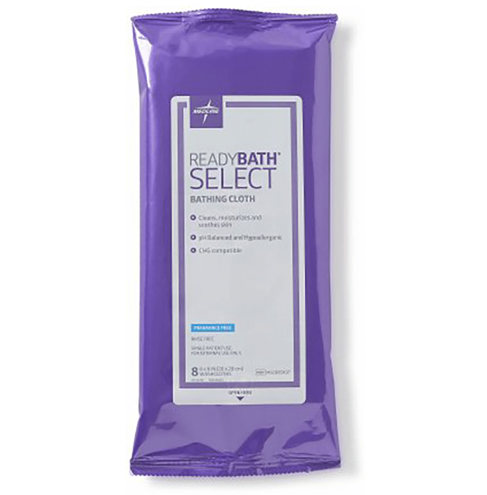 Medline ReadyBath SELECT Body Cleansing Washcloths are pre-moistened body cleansing clothes with a rinse-free formula. It eliminates the need for soaps, basins, linens, and lotions. | Uses: It is used to cleanse, moistens and soothe the skin It helps for gentle wash without using soap and water | Product Specifications and Features: Hypoallergenic and alcohol-free medium weight cloths Light, gender-neutral scent 8 washcloths/ pack 8 x 8 inches (20 x 20cms) Disposable cleansing cloths Latex-free Suitable for complete body wash | Directions for Use: Simply open up the pack, cleanse the body and throw the washcloth away | Safety Information: Keep it away from children Each clothe can be used once Only for external use
