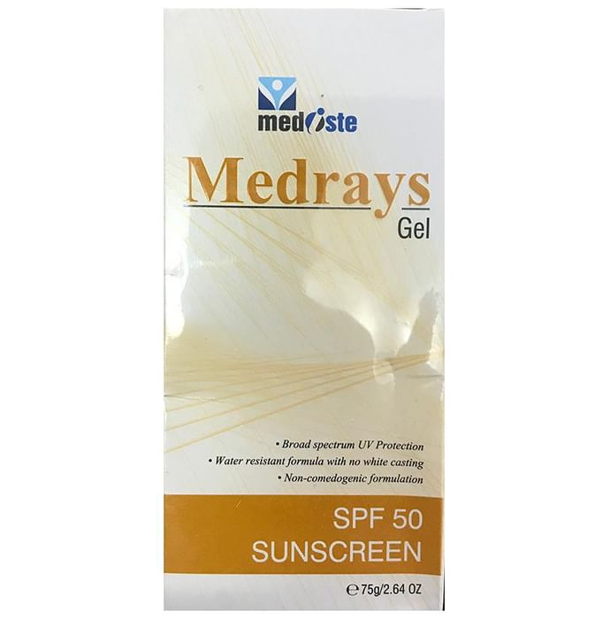 Medrays Sunscreen Gel SPF 50 used to protect the skin from the harmful effects of the sun. They help to prevent sunburn and premature aging (such as wrinkles, leathery skin). Its anti-aging properties prevent wrinkle formation and eliminate the fine lines on the skin. | Key Benefits: Protection from UV rays and provides a lasting effect Decreases depth of wrinkles and Prevents extreme tanning Prevents extreme tanning and heals sunburnt areas effectively | Direction For Use: Apply the amount on face and neck. Application to be done 15 minutes prior to sun exposure. | Safety Information: Read the label carefully before use To be used as directed and recommended by the physician Keep out of reach of children Store in cool and dry place For external use only