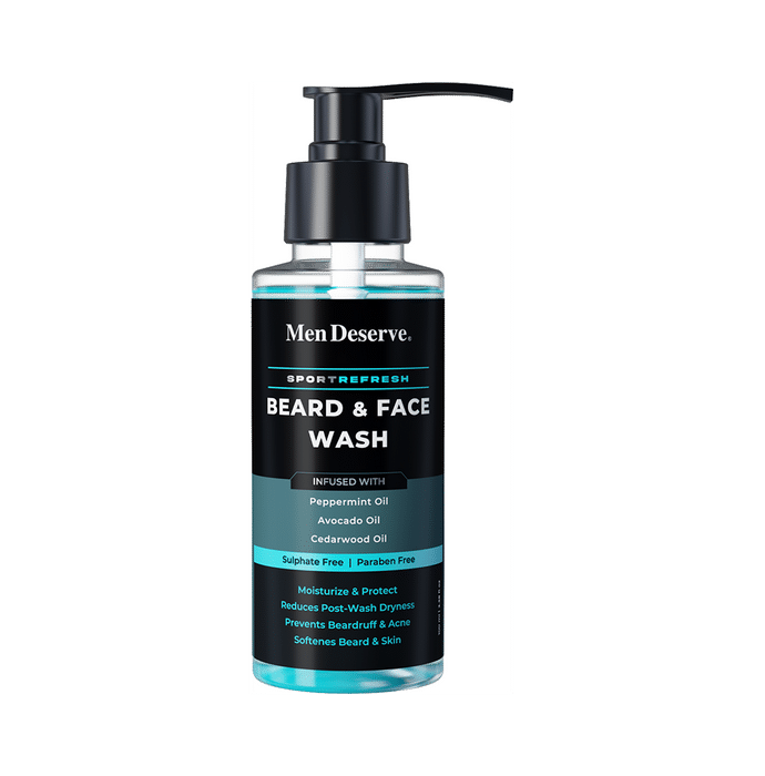 Men Deserve Sport Refresh Beard & Face Wash Men Deserve Sport Refresh Beard and Face Wash is infused with peppermint oil, avocado oil and cedarwood oil which helps to nourish your hair and skin. It deeply cleanses and removes dirt and pollutants from the skin. It also helps to prevent beardruff and acne and reduce post-wash dryness.