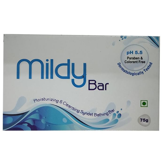 Mildy Bar is useful for moisturising dry skin while bathing and thoroughly cleansing the skin. It contains shea butter, which moisturises the skin. It also contains olive oil, which aids in the prevention of premature ageing signs such as fine lines and wrinkles. | Key Ingredients: Syndet base Potassium lauryl sulphate Shea butter Glycerin Olive oil | Key Benefits: Mildy Bar is beneficial for moisturising the dry skin while bathing and cleansing the skin deeply It contains shea butter which helps in keeping the skin moisturised along with combating free radicals with its antioxidant properties It also contains olive oil, which helps in delaying the signs of premature ageing such as fine lines and wrinkles | Directions For Use: Use as directed on the label. | Safety Information: Read the label carefully before use Do not exceed the recommended dosage Store in a cool and dry place away from direct sunlight Keep out of reach of children