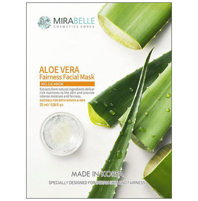 Mirabelle Cosmetics Korea Aloe Vera Fairness Facial Mask is a blend of unique ingredients that can help in treating sunburnt skin and help restore a youthful appearance. It is easy to use and provides great benefits to the skin. | Key Ingredients: Water Glycerin Hydrogenated Castor Oil Lavender Rosemary Liquorice Cellulose Gum Peppermint Panthenol Rice Bran | Key Benefits: Helps repair sunburnt skin and helps restore collagen to the skin Can help rejuvenate the skin making it look more radiant and youthful It can help hydrate the skin and makes it smooth and soft It May help reduce the appearance of blemishes and brighten dull skin | Direction For Use: Wash your face with normal water and wipe with a clean towel. Gently apply the face mask on your entire face Keep the mask on for 10 to 15 minutes before taking it off Do not wash your face after removing the mask | Safety Information: Read the label carefully before use Store in a cool and dry place away from direct sunlight Only meant for external use Keep out of reach of children