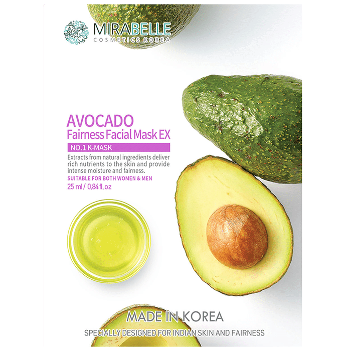 Mirabelle Cosmetics Korea Avacado Fairness Facial Mask EX is a blend of unique ingredients that can help to revitalise and restore a youthful appearance. It is easy to use and provides great benefits to the skin. It can also help in removing excess oil from the skin and reduce acne breakout. | Key Ingredients: Water Glycerin Hydrogenated Castor Oil Avocado Evening Primrose Betaine Trehalose Cellulose Gum Xanthum Gum Panthenol | Key Benefits: Helps repair damaged skin and helps restore collagen to the skin Can help repair aged skin and makes it look more youthful It May help reduce the appearance of blemishes and brighten dull skin Can help nourish the skin and makes it soft and smooth Can help remove tan and lightens the skin tone | Direction For Use: Wash your face with water and wipe with a clean towel. Gently apply the face mask on your entire face Keep the mask on for 10 to 15 minutes before taking it off Do not wash your face after removing the mask | Safety Information: Read the label carefully before use Store in a cool and dry place away from direct sunlight Only meant for external use Keep out of reach of children