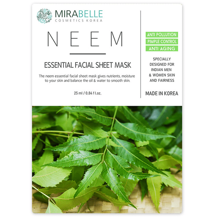Mirabelle Cosmetics Korea Neem Essential Facial Sheet Mask is a blend of unique ingredients that can help in the treatment of skin infection. It is easy to use and provides great benefits to the skin. It can also help in removing excess oil from the skin and reduce acne breakout. | Key Ingredients: Water Glycerin Hydrogenated Castor Oil Neem Evening Primrose Grape Betaine Trehalose Cellulose Gum Xanthum Gum Panthenol | Key Benefits: Helps repair damaged skin and helps restore collagen to the skin Can help in the treatment of skin infection It may help reduce the appearance of blemishes and brighten dull skin Can help nourish the skin and makes it soft and smooth It can help remove excess oil from the skin and help prevent acne breakout | Direction For Use: Wash your face with water and wipe with a clean towel. Gently apply the face mask on your entire face Keep the mask on for 10 to 15 minutes before taking it off Do not wash your face after removing the mask | Safety Information: Read the label carefully before use Store in a cool and dry place away from direct sunlight Only meant for external use Keep out of reach of children