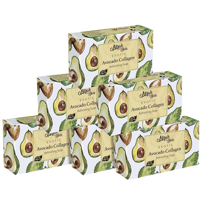 Mirah Belle Avocado Collagen Exotic Soap (125gm Each) Mirah Belle Avocado Collagen Exotic Soap contains the richness of avocado pulp and oil. Collagen formation in the face helps to keep your skin supple and wrinkle-free. Avocados are abundant in beta-carotene, lecithin, fatty acids, potassium and protein, all of which are not commonly found in fruits. They contain more vitamin E than any other fruit and are high in vitamin A and D. It is nutrient-dense, hydrating and softening to the skin. Avocado oil is a penetrating oil rich in vitamins A, B1, B2, pantothenic acid, E, lecithin, and fatty acids, and it offers vital nutrients to the skin. Sun-damaged and mature skin benefit greatly from this treatment.