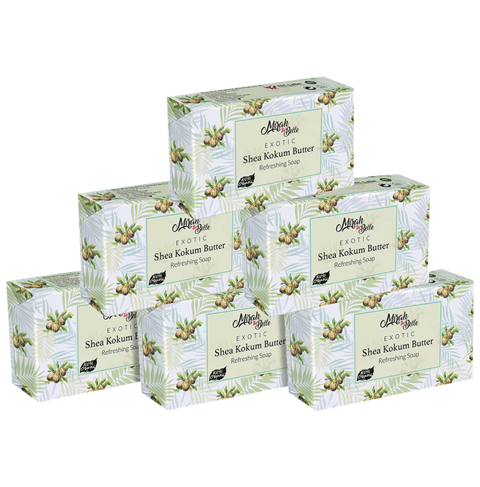Mirah Belle Shea Kokum Butter Exotic Soap (125gm Each) Mirah Belle Shea Kokum Butter Exotic Soap contains shea butter that speeds up wound healing and reduces scarring. It hydrates and nourishes the skin deeply, making it ideal for dry, damaged, and ageing skin. Vitamin E and necessary fatty acids are abundant in kokum butter. It has been used to soften and restore the flexibility of the skin. Essential fatty acids found in mango butter help to restore skin tone, suppleness, and flexibility. It's an excellent moisturiser for all skin types, but particularly for mature, dry, or sun-damaged skin.