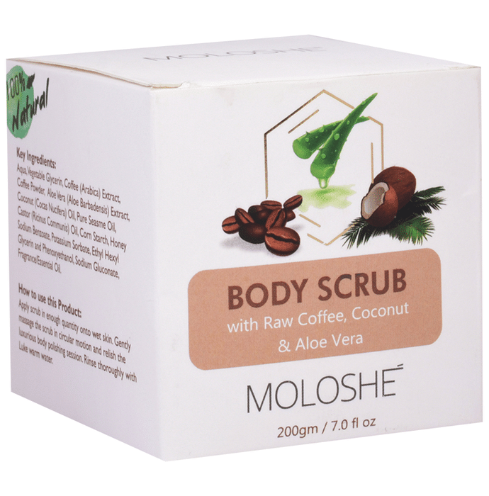 Moloshe Body Scrub is a raw coffee scrub which can help exfoliate and scrub away all your skin problems like tan, wrinkles, fine lines, acne, dull skin and appearance of cellulite. Coffee contains antioxidants, possesses anti-ageing properties, and can help manage common skin concerns like acne and pimples. This body scrub can help remove tan, acne, dryness, fine lines and soft skin. | Key Ingredients: Arabica coffee extract Coffee powder Aloe vera extract Coconut oil Pure sesame oil Castor oil | Key Benefits: It can help remove tan from the skin and clear clogged pores This body scrub can help reduce the appearance of cellulite on the skin and stimulates blood flow It can help combat acne, scars, blemishes, pigmentation, and fine lines It works on lightening dark neck, elbows, and knees and removing tan and dry skin Coffee provides a rich source of antioxidants and anti-ageing properties and cures common skin concerns like acne and pimples Coconut and sesame oil hydrates and nourishes skin, also can help to heal skin infections and imparts a natural glow | Directions For Use: Apply scrub onto the wet skin Gently Massage the scrub in a circular motion and relish the luxurious body polishing session Rinse thoroughly with the lukewarm water | Safety Information: Read the label carefully before use Keep out of reach of children Store in a cool, dry place away from direct sunlight If you have allergies consult your doctor
