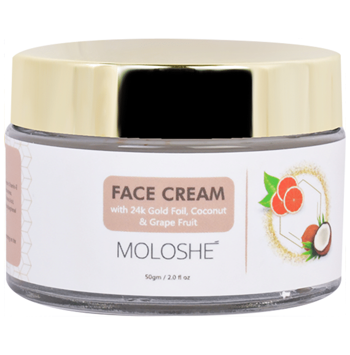 Moloshe Face Cream contains the goodness of vitamin C, coconut oil and grapefruit that can help revive dull skin and improve skin radiance. If you have delicate skin on the face and neck, this face cream can help provide moisture and make your skin smooth. Also, 24K gold flakes can help reduce acne and keep your skin glowing. | Key Ingredients: 24 kt gold foil Aloe vera Green tea Sandalwood Grapefruit Vitamin C Vitamin E Coconut oil | Key Benefits: It contains active vitamin C (grapefruit) and coconut oil that can help revive dull skin and improve skin radiance It can help provide a more youthful-looking complexion because of its anti-ageing properties Other ingredients like grapefruit and coconut oil can help protect the inner skin against melanin Aloe vera can help fade away dark spots and blemishes from the skin This product is 100% natural, sulfate-free, cruelty-Free and paraben-free | Directions for Use: Apply to cleansed face and neck Gently Massage into the skin, concentrating on the dull and dry areas, morning and evening | Safety Information: Read the label carefully before use Keep out of reach of children Store in a cool, dry place away from direct sunlight