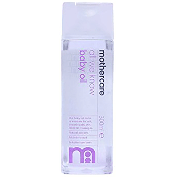 Mothercare All We Know Baby Oil Pack of 2 Mothercare All We Know Baby Oil contains Paraffinum Liquidum, Olea Europaea fruit oil(Olive), Helianthus Annuus (Sunflower) seed oil, Anthemis Nobilis(Chamomile) Flower extract as main active ingredients. Mothercare Baby Oil is ideal for massages and for keeping baby naturally moisturized. It is hypoallergenic and dermatologically tested. Key benefits/uses of Mothercare Baby Oil: Role of active ingredients: - Paraffinum Liquidum: Used to treat itchy, irritating dry skin conditions - Olea Europaea Fruit Oil (Olive oil): Contains anti-ageing antioxidants and hydrating squalene, making it superb for hair, skin, and nails - Helianthus Annuus Seed Oil (Sunflower oil): Applied to the skin; as it is effective against acne, eczema, scarring, redness, and irritation, it acts as the hydrating agent - Anthemis Nobilis (Chamomile) Flower extract: Has calming & soothing effect and also known to temporarily calm occasional red, dry, and irritated skin and useful for baby’s fragile skin Directions for use/Dosage: - Apply a small amount of wet and dry skin - For massage, apply to legs, arms and back using gentle soothing strokes Safety information: - For external use only - Keep away from the eyes a baby