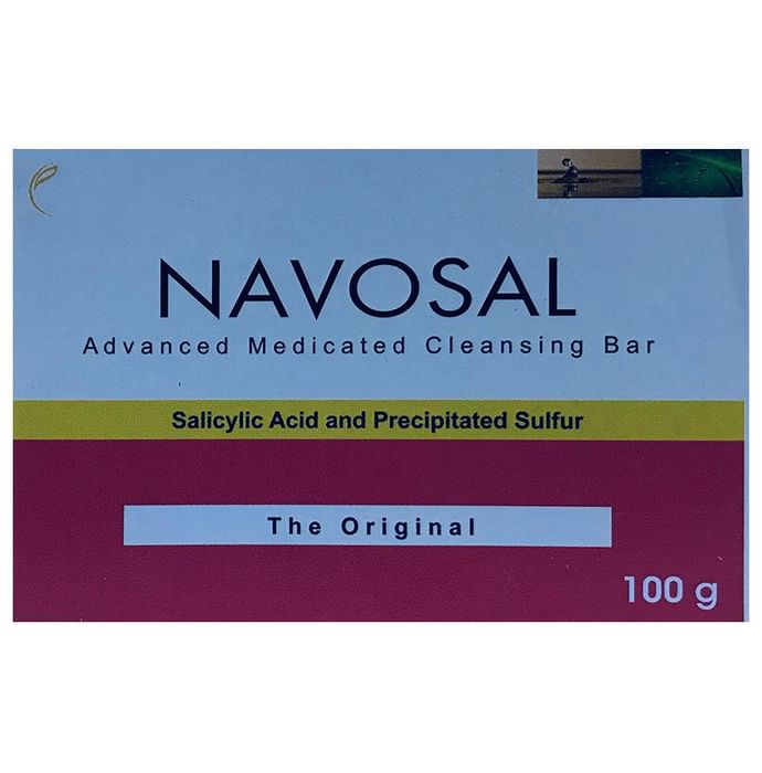 Navosal Advanced Medicated Cleansing Bar has natural antibacterial, antifungal, antiseptic and astringent properties. It leaves the skin soft and relieves from itches. This bar is soft on your skin and balances healthy organisms with saponified edible coconut oil, purified and structured water with probiotics ceramic rings, aloe vera juice, probiotics, certified lavender and peppermint essential oil. | Key Ingredients: Precipitated sulfur Salicylic acid | Key Benefits: It moisturises the skin and keeps it soft and smooth while maintaing pH level It helps to prevent unpleasant odours and irritations in the intimate area This soap has antibacterial and antifungal properties that fight unhealthy bacteria and fungus This product works as a natural astringent and helps to soothe irritated skin This soap prevents infections like ringworm and jock itch and keeps chaffing and rashes at bay The bar form allows for easy storage and is extremely travel-friendly | Directions For Use: Read the label carefully before use. | Safety Information: Read the label carefully before use Store in a cool and dry place away from direct sunlight Keep out of reach of children