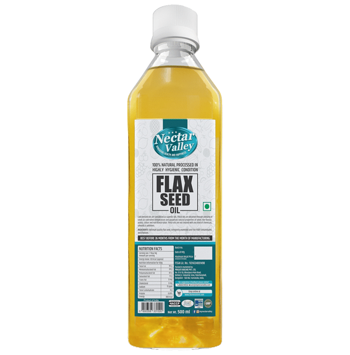 Nectar Valley Flax Seed Oil is specially formulated to lower blood cholesterol and blood pressure levels. It helps to improve kidney functions and provides relief in the condition of rheumatoid arthritis. In addition to this, Flax Seed Oil is known to reduce dandruff and flakiness of the scalp. | Key Ingredients: Flax seeds | Key Benefits: It helps to lower blood cholesterol and blood pressure levels Assist in improving kidney functions of the body Provides relief in the case of headache associated with hypertension It is used in the treatment of rheumatoid arthritis It helps to soothe skin irritation and softens roughness | Directions For Use: Use as directed by the physician. | Safety Information: Read the label carefully Store in a cool and dry place Keep out of the reach of children