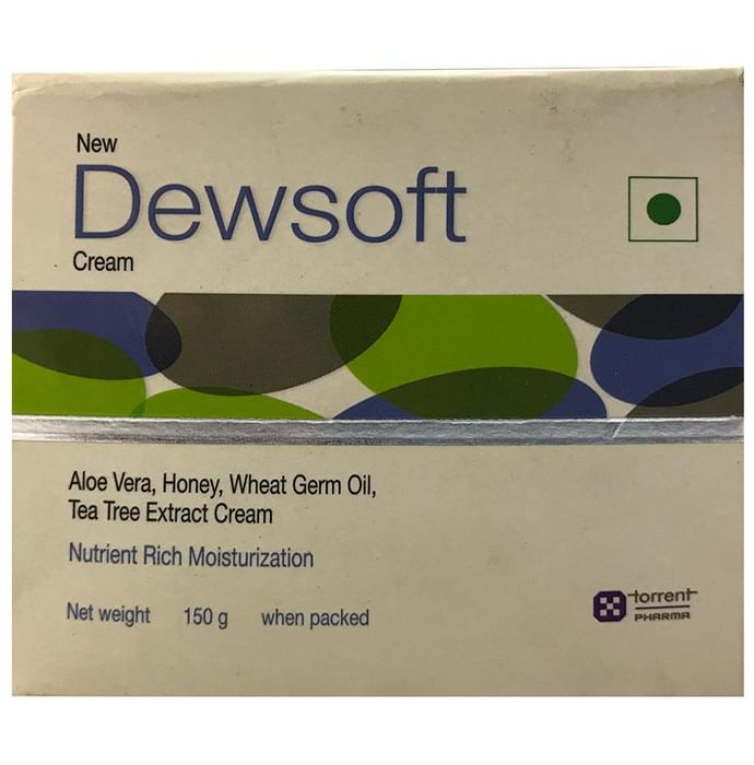 Dewsoft cream is a skin moisturizer that contains 10 percent aloe vera gel ,0.6 percent wheat germ oil,1 percent honey and 0.1 percent tea tree oil. Role of key ingrdeients:- Aloe vera gel to helsp keep the skin well hydrated.Wheat germ oil controls the development of bacteria, plus honey hydrates deep within the skin.Tea tree extract helps to reduce inflammation on the skin. Dewsoft cream is a moisturizer cream is used as a protective component. This helps to reduce irritation from intense forms of dryness and redness that might develop on the skin over time. Use under medical supervision.