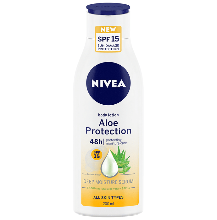 Nivea Aloe Protection Body Lotion SPF 15 Nivea Aloe Protection Body Lotion SPF 15 is enriched with 100% natural aloe extracts and replenishes the skin's lost moisture while protecting it from sun damage with its SPF 15 formula. This non-greasy, light formula with NIVEA's special deep moisture serum works deep inside your skin to keep it soft, smooth, and moisturised for up to 48 hours.