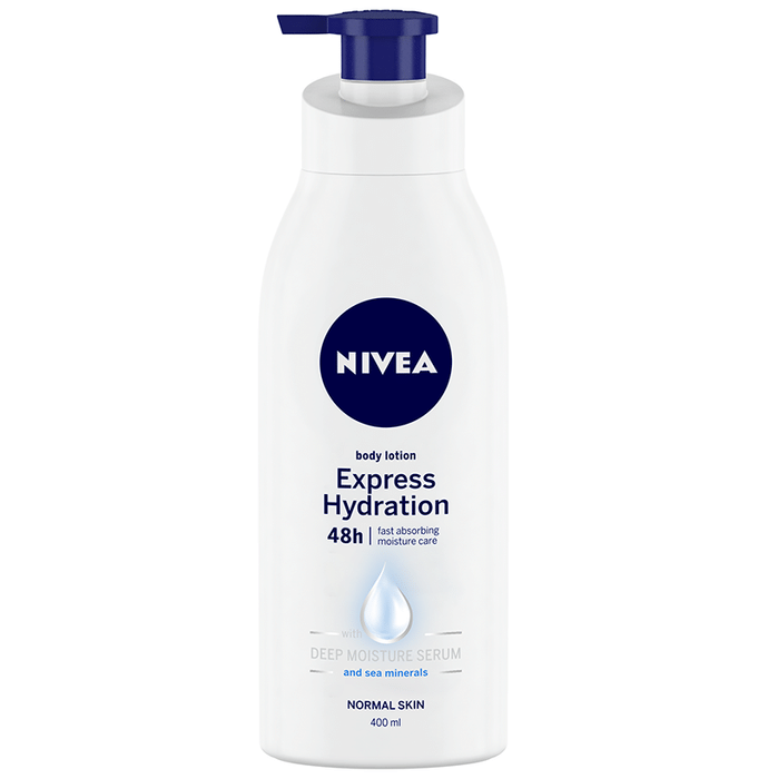Nivea Express Hydration Body Lotion is a light moisturizer that can be easily absorbed by the skin. It can help hydrate your skin and keep it soft and supple. A grease-free moisturizer that does not require you to wait for it to be absorbed before getting dressed to face the day. It can benefit those with normal and dry skin. | Key Ingredients: Aqua Paraffinum Liquidum Isopropyl Palmitate Glycerin Dimethicone Maris Sal Glyceryl Glucoside Sodium Hydroxide Phenoxyethanol | Key Benefits: It can help soften your skin and hydrates it It is a lighter lotion that can likely be absorbed into your skin within seconds The use of sea minerals could help in keeping your skin hydrated all day It is a cruelty-free lotion that is dermatologically approved | Directions For Use: Pump the required amount of lotion onto your palm Apply it all over your body, rubbing gently Gives better results when applied on damp skin | Safety Information: Read the label carefully before use Keep out of the reach of children Store in a cool and dry place For external use only