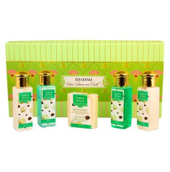Nyassa Temple Mogra Bath Ritual Gift Set includes: - Handmade Soap (50gm, 1 unit) - Shower Gel (50ml, 1 unit) - Body Lotion (50ml, 1 unit) - Shampoo (50ml, 1 unit) - Conditioner (50ml, 1 unit) Key benefits/uses: - Contains Mogra Extract, Shea Butter which provide intoxicating fragrance and moisturized the skin - Keeps skin blemish free - Suitable for all skin types Direction for use: Use as per the requirement Indications: Personal hygiene Safety information: -Read the label carefully before use -Keep out of the reach and sight of children