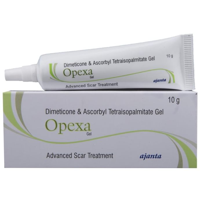 Opexa Gel Opexa Gel contains Dimethicone and AscorbylTetraisopalmitate, Silicone elastomer dispersion of decamethyl cyclopentasiloxane, Polydimethyl Siloxane, Dimethicone/Vinyl Dimethicone crosspolymer, Silica. - Opexa is a topical silicone gel - Opexa Gel works by reducing the free radical formation Key Benefits/uses of Opexa Gel: - Dimethicone and AscorbylTetraisopalmitate forms an invisible cover over the damaged area - Prevents the wrinkles formation in the skin - Transparent and quick drying - Maintains skin moisture - Flattens, softens and smooths scars - Reduces discolouration associated with scars - Opexa Gel acts as a base for cosmetics and make-up - Suitable for all skin types including children Directions for use/Dosage: As directed by the physician Indications: Chapped or cracked skin, Skin aging, Itchy skin, Ultraviolet rays induced skin damage, Dry skin, Canine atopic dermatitis. Safety information: - Read the label carefully before use - Keep out of the reach and sight of children