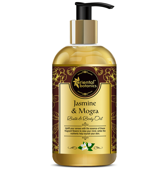 Oriental Botanics Bath & Body Oil with Jasmine & Mogra contains Sweet Almond (Prunus Dulcis)Cold Pressed Oil, Avocado (Persea Americana) Cold Pressed Oil, Soybean (Glycine max) Cold Pressed Oil, Apricot (Prunus armeniaca) Cold Pressed Oil, Virgin Golden Jojoba (Simmondsia Chimesis) Cold Pressed Oil, Grapeseed (Vitis vinifera) Cold Pressed Oil, Wheatgerm (Triticum Vulgare) Cold Pressed Oil, Fragrance Blend (Derived From Jasmine & Mogra Essential Oil) - This light and non-greasy oil will be quickly absorbed and leaves only a comfortable feeling Key benefits/uses of Oriental Botanics Bath & Body Oil with Jasmine & Mogra: - Quickly absorbed and leaves only a comfortable feeling - Make skin soft & smooth - Nourishing skin - Relaxing mind Direction for use/Dosage: - Add one or two tablespoons of oil to warm bath water, or apply directly to damp skin as a body moisturizer after showering Safety information: - Read the label carefully - Keep out of reach of children - Do not exceed the recommended dose
