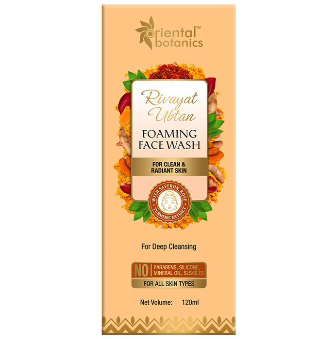 Oriental Botanics Rivayat Ubtan Foaming Face Wash cleanses and nourishes the skin to restore a natural glow. It can be a great addition to your morning and evening skincare routine. The face wash is infused with botanical extracts like Saffrin, Rose, Turmeric and Basil which makes the skin clear and radiant. | Key Ingredients: Purified water Coco betaine Aloe vera leaf extract Tulsi leaf extract Rose flower extract Hydrolysed soya protein Xanthan gum Neem Vitamin E acetate | Key Benefits: It deeply cleanses and nourishes the skin It helps remove dirt and grime It retains skin moisture balance It cleanses without drying the skin It provides a radiant glow | Directions For Use: Use as directed. | Safety Information: Read the label carefully before use Store in a cool and dry place away from direct sunlight Keep out of reach of the children