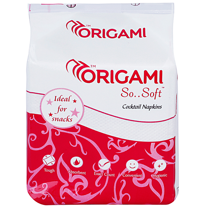 Origami So Soft Napkin These soft and absorbent quality tissues can be used with your snacks or can be clubbed with your drinks to keep your hands dry and the tabletops spot-free. These tissues are tough and strong. | Uses: It is used with your snacks or can be clubbed with your drinks to keep your hands dry and the tabletops spot-free. | Product Specifications and Features: Premium 1 ply tough tissues made with strong and absorbent material Useful in cocktail parties to cover your glasses and keep the tables spot-free | Directions For Use: Use as directed on the label. | Safety Information: Read the label carefully before use Store in a cool and dry place away from direct sunlight Keep out of reach of children