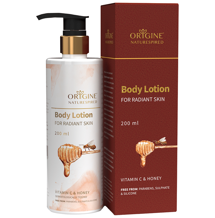 Origine Naturespired Body Lotion for Radiant Skin is a comforting lotion for skin rejuvenation. The rich combination of vitamin C and honey creates a nourishing formula for skincare. This light-textured soothing body lotion helps protect your skin from the depths. It helps get rid of dryness, dullness and flakiness of the skin and makes your skin look radiant, silkier, and glowy for 24 hours. It is suitable for all skin types and made from 100% pure vegan and cruelty-free ingredients to give side-effect-free care to your skin. As an added benefit, it is free of parabens, silicones and sulphates. | Key Ingredients: Vitamin C Honey | Key Benefits: It helps reduce dryness and flakiness It helps lock in moisture and keeps the skin hydrated It helps improve the skin texture and complexion It fades away all the imperfections bringing out a radiant glow It helps the skin rejuvenate and regenerate It leaves the skin silky soft and supple It helps deep clean the skin from within It is dermatologically tested and clinically approved It is a natural product which is paraben-silicon-chemicals free | Directions For Use: Use as directed on the label. | Safety Information: Read the label carefully before use Keep out of reach of the children Store in a cool dry place