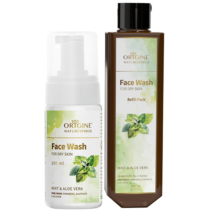Origine Naturespired Face Wash 100ml With Refill pack 200ml for Dry Skin is the perfect face wash that makes skin hydrated, nourished, and repaired from deep layers. Say goodbye to dryness naturally with this perfectly vegan face wash. | Key Ingredients: Mint Cucumber Orange Aloe vera Vitamin e | Key Benefits: It is crafted with mint, cucumber, orange, aloe vera, and vitamin e foaming to nourish your dry skin It removes dirt, dust, and impurities naturally to moisturize and hydrate the skin This face wash is free from harsh chemicals and artificial chemicals and made using pure 100% vegan ingredients picked from nature It offers effective care to sensitive skin and all skin types to tackle all types of skin concerns naturally | Directions for use: Pump tiny amounts of foaming face Wash all over your wet face and neck For 2 minutes, gently massage this foamy cleanser with the brush in small circular strokes Wash off and pat dry Get spot-free, clear, and glowing skin naturally | Safety Information: Avoid direct contact with eyes If contact occurs, splash plenty of water Discontinue use if redness or inflammation occurs