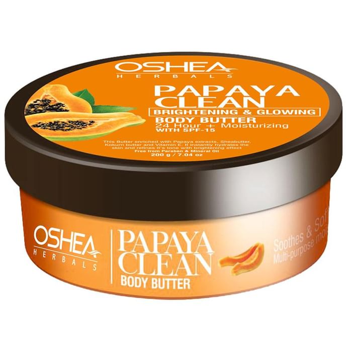 Oshea Herbals Body Butter Papayaclean Oshea Herbals Body Butter is designed to moisturize and nourish the skin. The ingredients present in the product are helpful in removing dark spots and blemishes. It also contains skin softening and soothing properties. In addition to this, it comes in four different variants namely, Glopure, Strawberry, Papayaclean, and Cocoa.