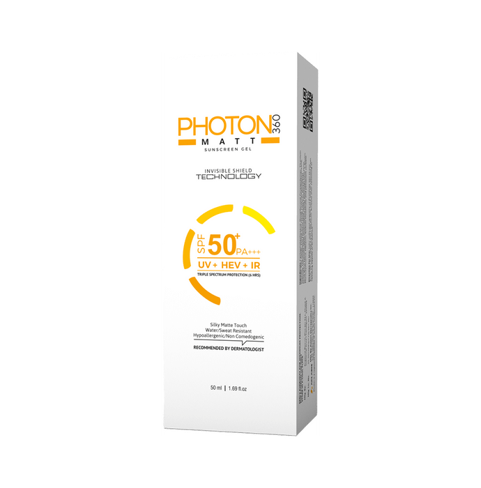 Photon 360 Matt Sunscreen Gel SPF 50+ Photon 360 Matt Sunscreen Gel SPF 50+ is a sunscreen enriched with powerful antioxidants that form a layer of protection on the skin. It delivers long protection against UVA and UVB rays, high energy visible rays, blue lights and infrared rays which are responsible for ageing and sunburn respectively moreover it is hypoallergenic and water and sweat resistant. It is a light formulation that has a non-shiny finish.