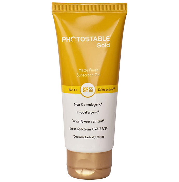Photostable Gold Sunscreen Gel Spf 55 Photostable Gold Sunscreen Gel is dermatologically tested and provides SPF 55 and UVA protection from harmful rays. This sunscreen gel can likely suit normal to acne-prone oily skin. It can aid in protecting your skin from sunburn and delay premature ageing.