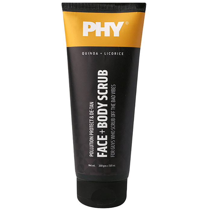 Phy Pollution Protect & De-Tan Face + Body Scrub Phy Pollution Protect & De-Tan Face + Body Scrub is formulated with Quinoa and Liquorice to help exfoliate, refresh the skin, and wash off the effects of pollution and the sun. It gives an at-home spa experience and may make the skin look glowy and healthy. It is suitable for all skin types.