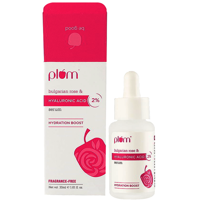 Plum Bulgarian Rose & Hyaluronic Acid 2% Face Serum Plum Bulgarian Rose & Hyaluronic Acid 2% Face Serum is a combination which helps you achieve your desired skin. It helps replenish your skin and locks the moisture in for long-term hydration. It positively affects the skin as it defends against the early signs of ageing. This hydrating booster with a punch of Bulgarian rose pulls moisture deep into the skin and locks it in there, leaving instant plump, soft skin. It provides multi-level hydration. Hyaluronic acid is proven to be safe for dry and dull skin. This product is paraben-free, dye-free, cruelty-free, vegan, and dermatologist-tested.