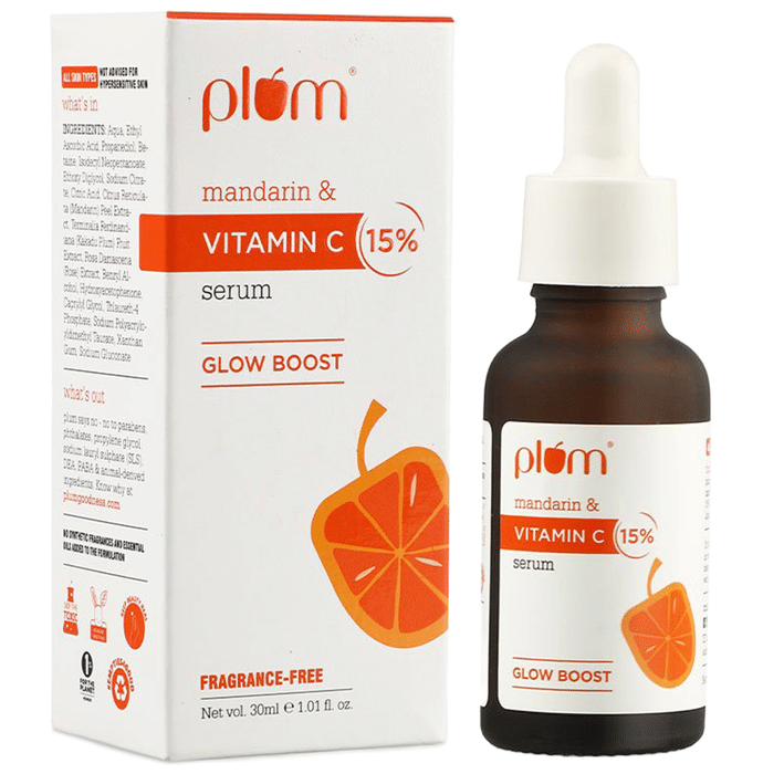 Plum Mandarin & Vitamin C 15% Face Serum is infused with the natural element of vitamin C and mandarin extracts that provides your skin with adequate hydration and makes it glow. Vitamin C absorbs impurities and excess oil from the skin and restores the suppleness and youthfulness of your skin. It gently exfoliates and improves the texture of your skin. It shields the skin from UV damage and supports numerous well-known functions, including promoting collagen production and aiding in antioxidant defence against UV-induced photodamage. This product is paraben-free, dye-free, cruelty-free, vegan and dermatologist-tested. | Key Ingredients: Vitamin C Mandarin peel extract | Key Benefits: This serum improves skin texture and brightens up your skin Vitamin C accelerates cell regeneration and boosts collagen, helping the skin shed dead cells It is skin firming, retains skin's elasticity and improves fine lines and wrinkles It helps control oil, prevents UV-induced pigmentation, boosts hydration, and normalises skin pH | Directions For Use: Cleanse your face and apply the serum Let it absorb | Safety Information: Read the label carefully before use Store in a cool and dry place, away from sunlight Keep out of reach of children For external use only