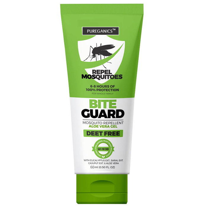Pureganics Bite Guard Mosquito Repellent Aloe Vera Gel Deet Free Pureganics Bite Guard Mosquito Repellent Deet-free with aloe vera gel is a blend of active eucalyptus, cajuput and saral combined. It keeps mosquitoes at bay, safe for the skin, and for regular use. It protects from mosquito-borne diseases like dengue, malaria, and chikungunya. Its active ingredients not only nourish and moisturize the skin but also provide complete 8-hour protection.