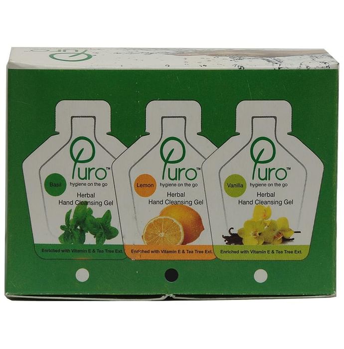 Puro Herbal Hand Cleansing Gel Sachet is an alcohol-based sanitizer which destroys the germs 99.99% instantly. It is made with ingredients that moisturize the skin leaving it clean and smooth. | Key Ingredients: Isopropyl Alcohol Glycerine Carbopol Utrez 20 Ethylene DI Amine Tetra Acetic Acid Tea Tree Extract Lemon Extract Triclosan Vitamin E Lemon Perfume Aloe Vera Extract | Key Benefits: Kills 99.99% germs from the hands in a few seconds Effective against bacteria, virus, and fungi Moisturizes the skin making it clean and smooth Mild fresh fragrance Comes in a 1ml sachet for one-time use Sachet made out of special laminate for handling spirit content | Directions for Use: Take the sanitizer and tear the sachet on the cut marks. Apply on hands and rub thoroughly. Get clean hands instantly. | Safety Information: Read the label carefully before use Advisable to allow children to use it under adult supervision Store in a cool and dry place