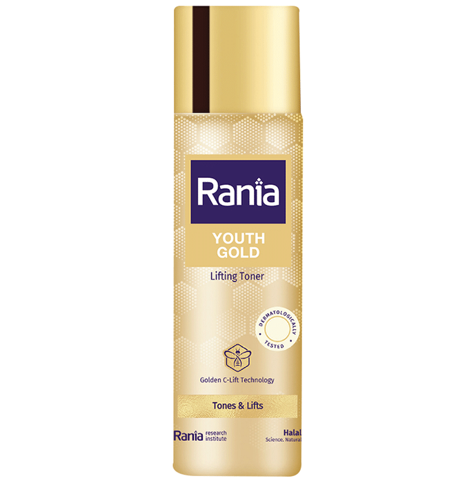 Rania Youth Gold Lifting Toner can maintain youthful skin with skin lifting benefits. Golden C-lift technology combines vitamin C stabilised with gold and nano gold 24K that might micro-repair and keep skin young, firm and lifted. It is Halal certified in Malaysia and India. It is made at Rania research institute, Malaysia's world’s largest Halal skincare R&D facility. It is an alcohol-free toner for the face. A soothing water-based toner formulated with a blend of rose essence and licorice extract. This skin toner may help calm and soothe discomfort and boost skin hydration. It suits a daily skincare regime as it preps and tones the skin and can result in refined, refreshed, and lifted skin. This toner can moisturise the skin for a smooth, petal-soft, and supple complexion. The golden C-lift technology in this hydrating toner combines advanced and powerful age-defying and skin-lifting ingredients such as golden C and nano gold 24K. These ingredients can enhance deeper penetration into skin layers to tone and lift the skin. Infused with the goodness of golden C, an antioxidant, it can protect the skin from harmful external aggressors and promote skin regeneration. Another powerful ingredient is nano gold 24K, which might restore elasticity and refine the skin texture for supple and lifted skin. It is vegetarian, paraben-free, alcohol-free and mineral oil-free. | Key Ingredients: Gold stabilised vitamin c Nano 24k gold Niacinamide Pearl powder Honey Rose essence Golden c-lift technology | Key Benefits: It contains vitamin C stabilised with gold is an antioxidant that might micro repair the skin and reduce pigmentation It is Halal certified in Malaysia and India The golden C-lift technology, in this toner, can help in maintaining youthful, firm and lifted skin It contains advanced skin lifting ingredients The toner is formulated at Rania research institute, the Halal skincare R&D facility in Malaysia It has an alcohol-free soothing formula with rose essence and can boost skin hydration for toned, refined, supple skin It may soothe, calm and soften skin while reducing skin redness and restoring elasticity The nano gold 24K in this toner can penetrate deeper into skin layers to improve elasticity and hydration | Directions For Use: Cleanse your face Pour sufficient amount onto palm Apply evenly on face and neck, and pat gently until fully absorbed Get firm, hydrated and glowing skin Use twice a day for best results | Safety Information: Read the label carefully before use Store in a cool and dry place, away from sunlight Keep out of reach of children