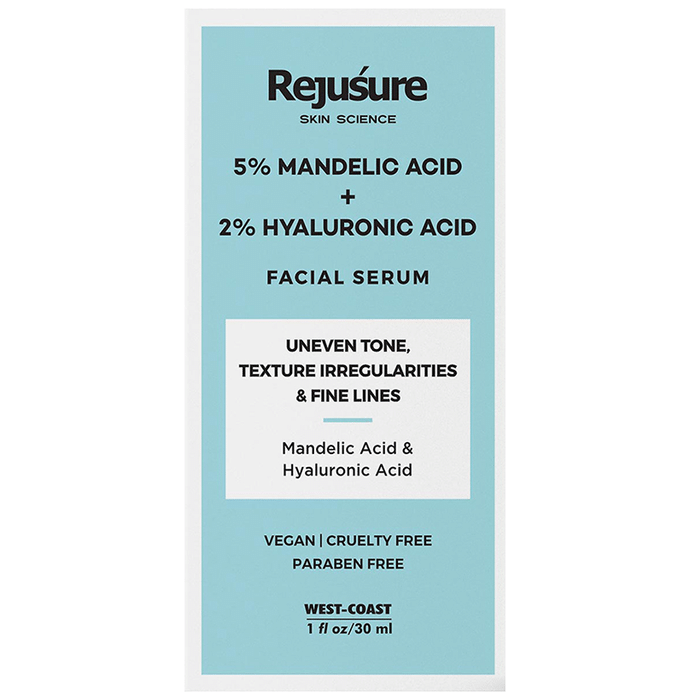 Rejusure 5% Mandelic Acid + 2% Hyaluronic Acid Facial Serum is an innovative formulation that offers superficial dermal peeling that is gentle. The molecular weight of mandelic acid is larger than that of other alpha hydroxy acids and this larger size means that it penetrates the skin more slowly. This makes for a milder exfoliating experience that will suit even the most sensitive complexions, leaving skin smoother, more even and gorgeously glowing. This product is paraben-free, dye-free, essential oil-free, cruelty-free, vegan and dermatologist tested. | Key Ingredients: Mandelic Acid 5% Hyaluronic Acid 2% | Key Benefits: This innovative formulation offers superficial dermal peeling This makes for a milder exfoliating experience that will suit even the most sensitive complexions, leaving skin smoother, more even and gorgeously glowing Dead skin cells are removed to aid in the treatment of skin texture irregularities This product is paraben-free, dye-free, essential oil-free, cruelty-free, vegan and dermatologist tested | Directions For Use: Step 1: Apply once per day, ideally in the PM. Can be diluted with other treatments to reduce strength until the skin develops tolerance. Avoid contact with eyes. If irritation persists, discontinues use and consultation with a dermatologist Step 2: Use only as directed. Contact of the product with the skin must be of limited frequency or duration | Safety Information: Read the label carefully before use Keep out of reach of the children Store in a cool dry place
