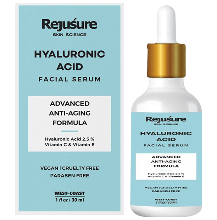 Rejusure Hyaluronic Acid Facial Serum effective helps in hydration and has anti-ageing benefits. It heals dryness on face with intense hydration. The skin-plumping properties help reduce fine lines and wrinkles. It helps give a brighter complexion, lightens dark under-eye circles and puffiness. Hyaluronic acid effectively binds water to cells and is responsible for the elasticity and resiliency of the skin. Such properties make hyaluronic acid serum effective in transforming skin to promote a healthy and balanced glow. It helps to protect the skin from free radicals, sun exposure and environmental stresses by nourishing it with powerful antioxidants like vitamin C, vitamin E and aloe vera gel. | Key Ingredients: Hyaluronic Acid Vitamin C and E Aloe Vera Gel | Key Benefits: Hyaluronic acid facial serum with vitamin C and E work quickly to hydrate the skin and help reduce the flaky or peeling skin spots It replenishes water from outside and holds water from inside, helping in improving the hydration and elasticity of the skin It boosts the wound healing process of the skin Facial Serum is meant for all skin types including, those with dry skin Rejusure Hyaluronic Acid Serum is paraben-free, sulphate-free, gluten-free and cruelty-free Ideal For: Men and Women Skin Type: Dry and normal skin Application Area: Face | Directions For Use: Wash and clean the face Spread few drops of the serum evenly over the face and massage it for 2-3 minutes Let it soak properly | Safety Information: Read the label carefully before use Keep out of reach of the children Store in a cool dry place