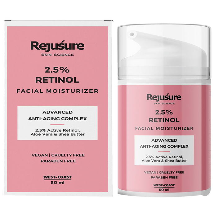 Rejusure Retinol Facial Moisturiser is formulated to provide daylong hydration and anti-ageing support. The goodness of natural ingredients infused in the cream rejuvenates the skin. The protective barrier of the skin is strengthened and the harmful effect of exposure to sun damage and pollutants is averted. Whether you have combination skin, this anti-ageing moisturizer will fit perfectly into the skincare regimen. | Key Ingredients: Shea butter Retinol Aloe Vera Gel | Key Benefits: Vitamin A (Retinol) has been proven to be one of the most effective ingredients to improve fine lines, wrinkles, skin tone, skin texture, colour, pigmentation, as well as the skin's hydration level. It is one of the most trusted ingredients to fight ageing concerns This moisturizer uses the power of vitamin A (Retinol), shea butter and aloe vera to provide intense antioxidant benefits for beautiful skin and optimal results. This makes it the perfect cream polish to achieve radiant, soft and refreshed skin This moisturizer is great for a wide variety of skin types, which makes it a fantastic addition to any skincare regimen. Use of this retinol moisturizer at day or night on cleansed skin is recommended, using any applicable serums first Rejusure products are cruelty-free, paraben-free, and sulphate-free and environment- friendly are made from globally sourced ingredients Ideal For: Men and Women Skin Type: Normal and Combination skin Application area: Face and Neck Goodness: Free from sulphates, parabens, cruelty-free and mineral oils | Directions For Use: Wash and pat skin dry. Apply to the face and neck Gently massage into the skin with circular upward motions. Can be used in morning and night Use regularly for best results. Use sunscreen daily as retinol increases sun sensitivity | Safety Information: Read the label carefully before use Keep out of reach of the children Store in a cool dry place