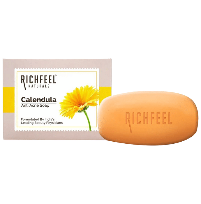 Richfeel Calendula Soap It is a daily deep cleansing formula for clear and radiant skin. It embraces the flora’s anti-bacterial properties, which may help manage acne and troubled skin. It helps remove impurities and excess oil from the skin’s surface. Its rich flavonoid content protects the skin cells from damage caused by oxidation. | Key Ingredients: Calendula extract | Key Benefits: It is a daily deep cleansing formula for clear and radiant skin Calendula is known for its calming and soothing properties It gently cleanses and refreshes the skin It embraces the flora’s anti-bacterial properties, which may help manage acne and troubled skin Its rich flavonoid content also protects the skin cells from damage caused by oxidation It helps remove impurities and excess oil from the skin’s surface It soothes and improves the skin to create a more balanced and even skin tone | Directions For Use: Use as directed on the label | Safety Information: Read the product label carefully before use Store in a cool and dry place away from direct sunlight Keep out of reach of children