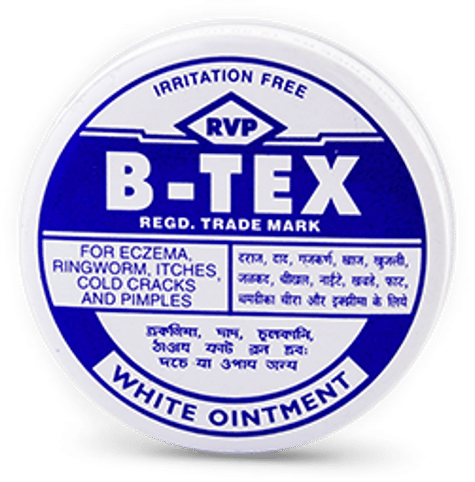 RVP B-Tex Ointment White RVP B-Tex Ointment is a powerful ayurvedic combination of germicide, bacteriocidal, eschorotic, antiseptic, anesthetic and anti pruritic. It is useful for eczema, ringworm, itches, cold cracks and pimples.
