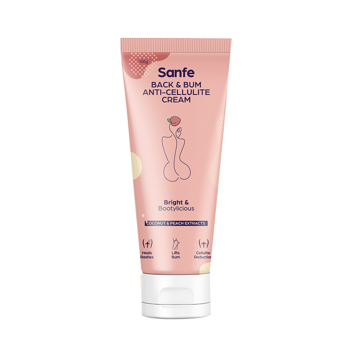 Sanfe Back & Bum Anti-Cellulite Cream Sanfe Back & Bum Anti-Cellulite Cream is curated to help with cellulite reduction and prevent its formation. This anti-cellulite bum cream consists of pure coconut and peach extract that helps in lightening the skin and reducing dark spots. It further makes the skin tighter, firmer which gives the bum a healthy and youthful lift. The cream has antibacterial and antifungal properties and is also beneficial in the treatment and prevention of acne and rashes.