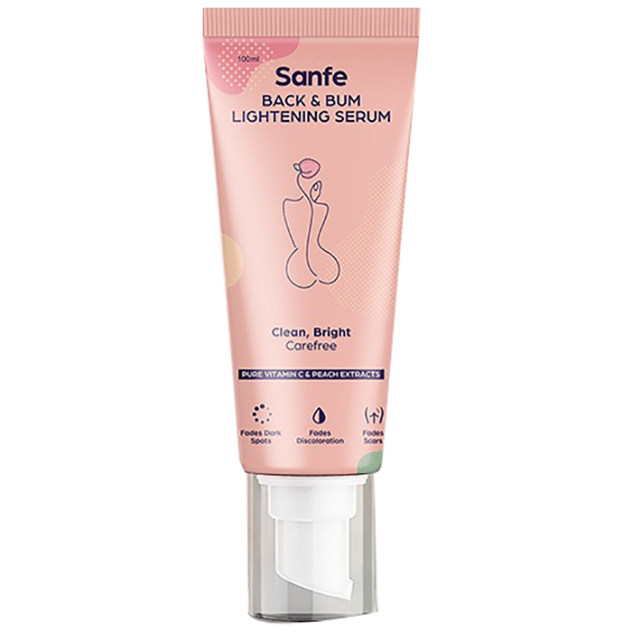 Sanfe Back & Bum Lightening Serum helps to brighten the rough bum skin, removes tanning, blackheads, reduces pigmentation and does not dry out the skin. Formulated with natural ingredients like witch hazel extract, peach extract, liquorice extract and coconut oil, it helps to moisturise, rejuvenate, hydrate and soften the bum skin. It is suitable for all skin types and is extremely nourishing for the skin. | Key Ingredients: Witch hazel extract Peach extract Licorice extract Vitamin C | Key Benefits: Provides the nourishment and nutrients of witch hazel extract, vitamin C, aloe vera and other moisturising ingredients to the skin It contains active ingredients that reduce excessive melanin production, brightens the skin naturally, reduces hyperpigmentation and improves the skin texture Provides hydration and moisturisation to the skin, making it softer, smoother and healthier May help remove dead skin layers by promoting cell renewal and removing sun tanning It contains active ingredients that reduce dark spots, acne bumps, dullness and rashes | Directions For Use: Use as directed on the label or as suggested by the physician. | Safety Information: Store in a cool and dry place away from direct sunlight Keep away from children Do not use if the seal is damaged or missing Read the label carefully before use