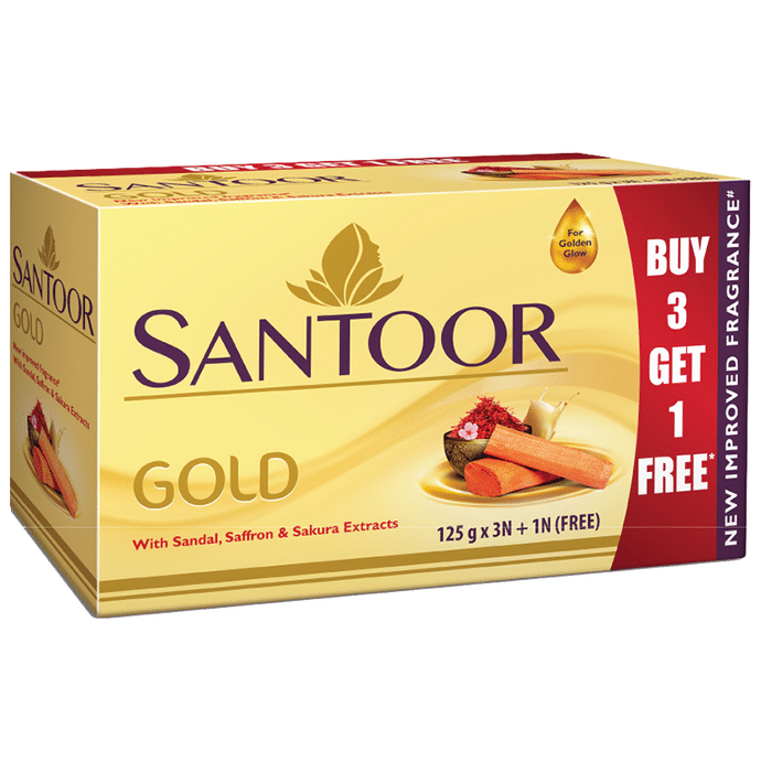 Santoor Gold Soap 125gm (Buy 3 Get 1 Free) Santoor Gold Soap 125gm (Buy 3 Get 1 Free) crafted with sandal, kashmiri saffron, and sakura, this soap provides glowing and vibrant skin. This blend of sandalwood and saffron soothes the mind and makes one feel refreshed for a long time.